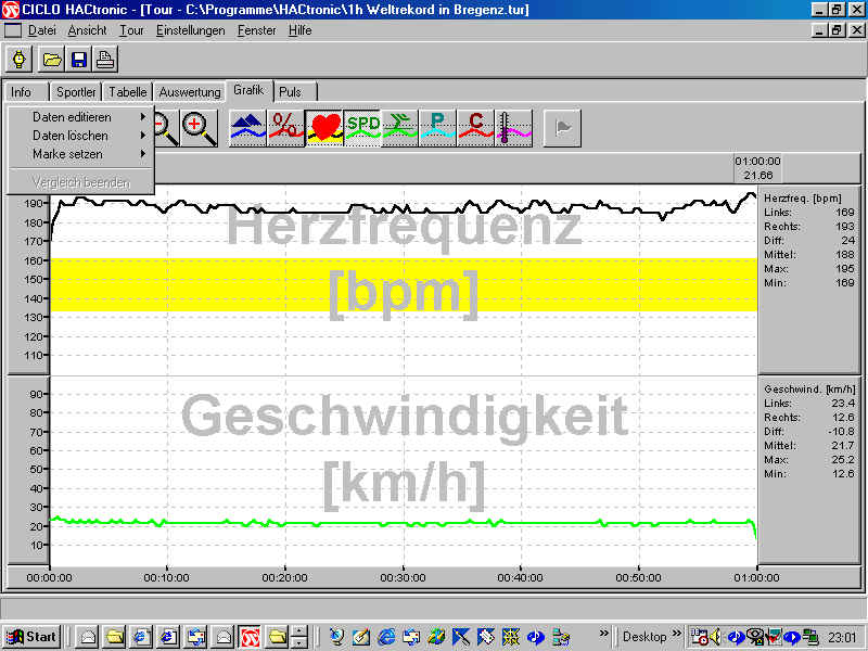 Titel: 1h Weltrekord mit 26- Zoll Einrad Startort: Bregenz , Oesterreich Zielort: Datum: 24.09.2000 Uhrzeit: 11:40 Notizen: Name: Gauler Vorname: Stefan Geburtsdatum: 21.05.1969 Verein: - Gewicht: 67 obere Hf: 161 untere Hf: 133 Material: Pichler- Einrad,26 Zoll, Kurbellänge 5 Zoll